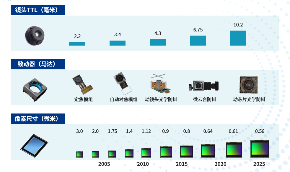 1) 镜头:汇聚光线。随着镜片数增加,图像传感器芯片增大,镜头总高从2.2mm增长到10.2mm左右;